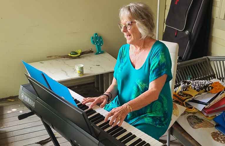 Live entertainment filled the space as Galleries in the Gardens President Anne Stuart played familiar tunes on the keyboard, while outside in the sunlight the enormous inflatable Reg Mombassa fish continued to “swim”.
