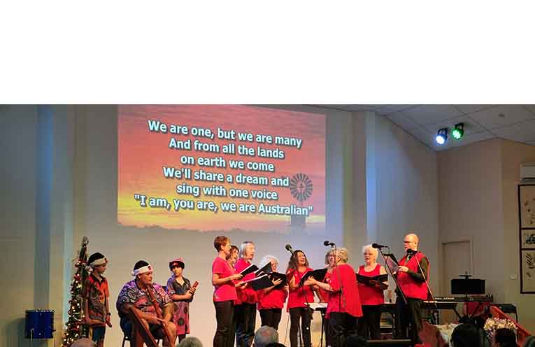 The first song, “We Are Australian”, was delivered by the Myall U3A choir and was enhanced by the inclusion of local indigenous man Thomas Franks playing the didgeridoo. He was joined by his kids on stage.