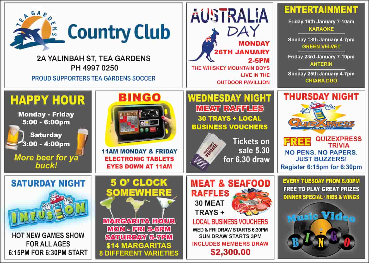 The same date also held the annual Combined Churches Carols night at Tea Gardens Baptist Church, starting with a free sausage sizzle and ice cream, then into the main hall for songs.